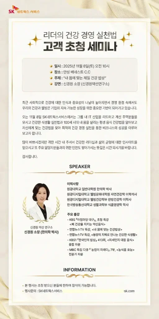 신경원 한의학 박사는 안성 베네스트 C.C에서 열린 SK네트웍스서비스 우수 협력사 CEO 대상 VIP 세미나에서 <리더를 위한 건강관리> 강연을 성공적으로 진행했습니다. 이번 행사는 IT·네트워크 산업 분야의 핵심 협력사 대표 및 임원급 리더가 참석한 프로그램이었습니다.