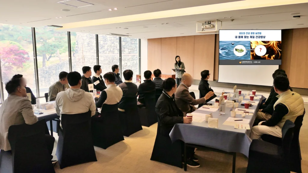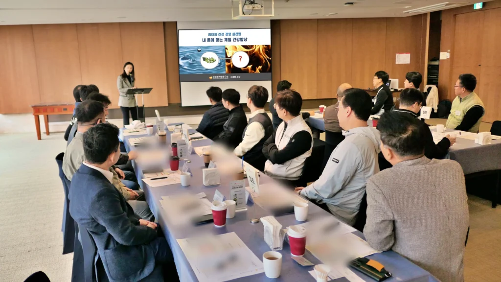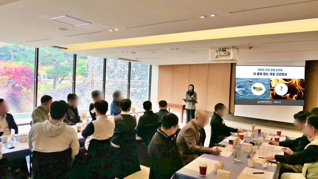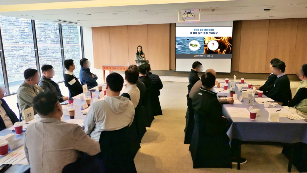 리더를 위한 체질 건강 전략 강의는 <내 몸에 맞는 체질 건강 밥상>을 중심으로 구성했습니다. 협력사 리더가 일과 현장에서 바로 활용할 수 있는 내용에 집중했습니다.