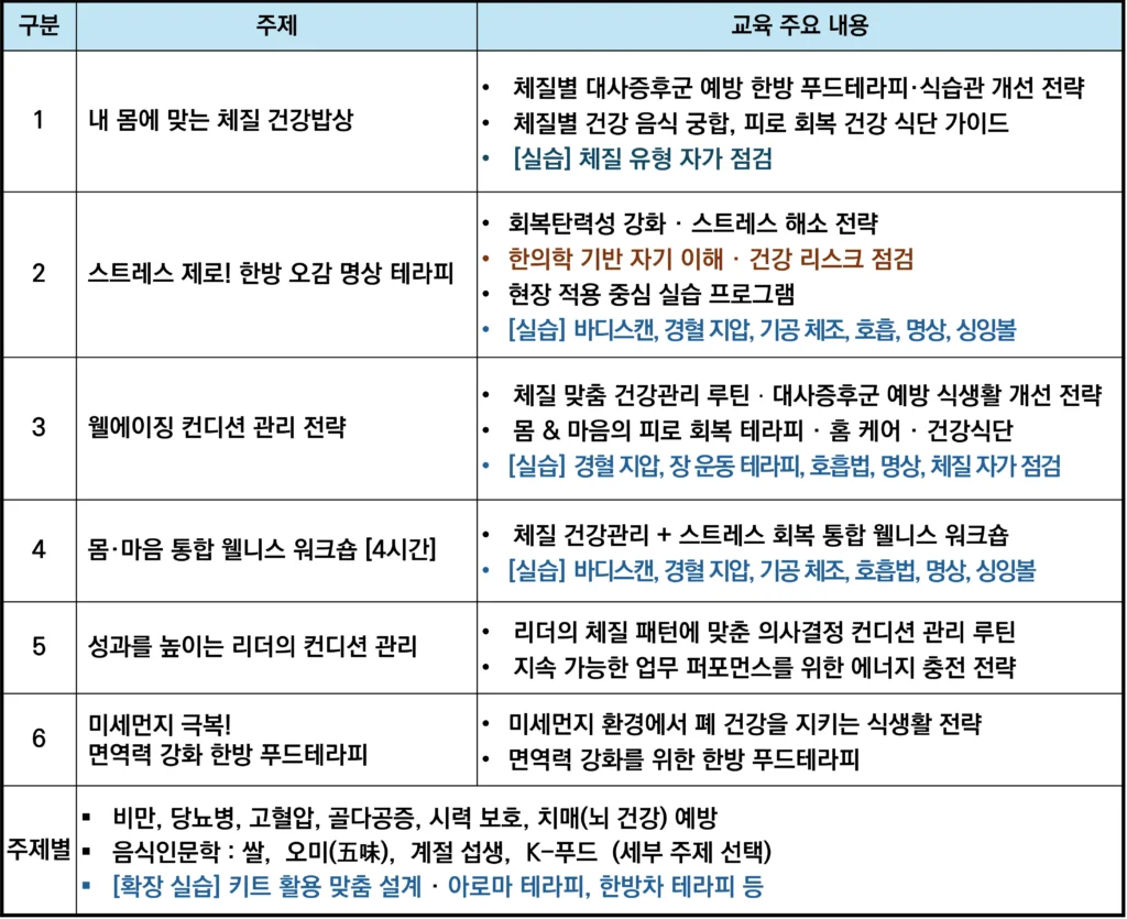 본 커리큘럼은 중장년층이 노후 준비 대사증후군과 스트레스 예방·관리에 바로 활용 가능한 한의학 기반 몸·마음 건강관리 방법을 익히도록 설계했습니다. 교육 직후 곧바로 실생활 속에서 적용할 수 있는 자기 돌봄 루틴을 형성하는 데 초점을 두고 있습니다.